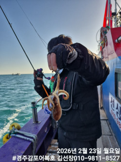 2/23일 월요일 왕쭈구미 낚시중입니다.오늘도 포인트에 도착하자마자 잘올라옵니다.수박 수평에기와 고추장에기에 반응이 월등하네요!조금전 왕쭈구미 낚시를 마치고 감포항으로 입항중입니