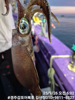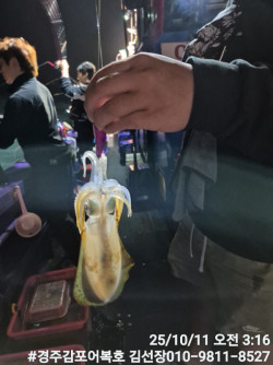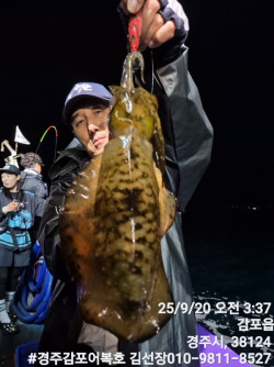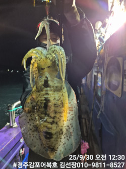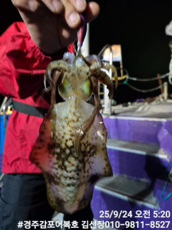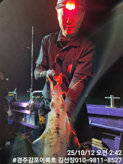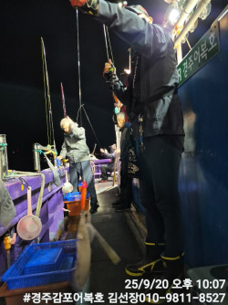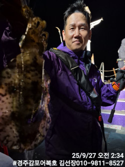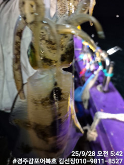 10/25일 토요일 실시간 조황보고입니다.첫포인트 19시05분 첫고기 나왔습니다.둘째 포인트에도 무늬들이 얼굴들을 보여주네요! 계속 잘 나와줍니다.오늘은 비도오고 전반적으로 악조건인데도 마리수도 많이 나오고 사이즈도 엄청좋은 출조였습니다.오늘 일요일 저녁타임에도 기상이 허락을 하네요!시간되시는분 무늬어복호로 놀러오세요! 내일새벽 타임은용왕님께서 허락을 안하셔서 저녁타임만하고 종료할까 합니다.감사합니다.#경주어복호무늬오징어낚시 오늘 신기록 1,315g갱신 되었어요! 축하드려요!1,140g 오늘 키로오바급 많이 올라오네요!오늘 신기록 1,250g나왔습니다.*** 경주 어복호 예약 안내 ***예약문의 : 010-9811-8527오시는길 : 경북 경주시 감포읍 감포로2길 93 앞부두홈페이지 : http://eobokho.sunsang24.com/