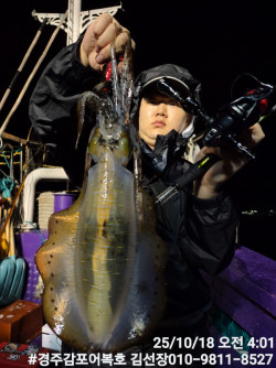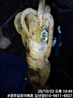 10/19일 일요일 무늬어복호 실시간조황 보고입니다!오늘도 깊은 수심에서 키로급 무늬들의 반응들이 좋네요!뜰채의 묵직한 무게가 느껴집니다.내일 새벽부터 풍랑주의보라 수요일정도 되어야 날씨가 풀어지네요!날씨예보 계속 보고있다가 좋아지면 바로 출항공지 올려드릴께요!감사합니다. #경주어복호무늬오징어낚시*** 경주 어복호 예약 안내 ***예약문의 : 010-9811-8527오시는길 : 경북 경주시 감포읍 감포로2길 93 앞부두홈페이지 : http://eobokho.sunsang24.com/