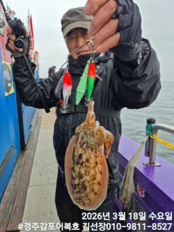 3/28일 토요일 왕쭈구미 낚시하러 경주감포어복호로 모십니다!덤으로 갑오징어가 간간히 올라오네요!토요일부터 갑오징어를 1호 ~10호까지 선착순 먼저 잡으시는 10분께 무료승선권 1