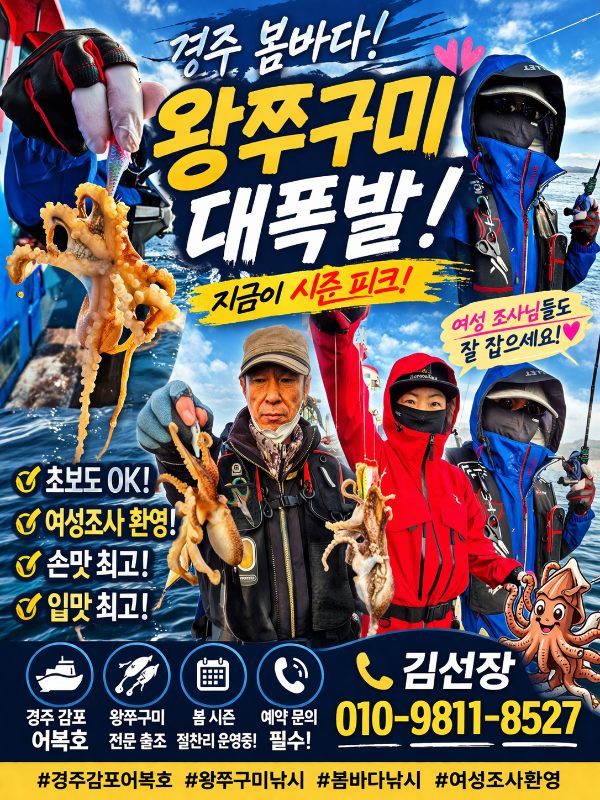 ![]() ![]() ![]() ![]() ![]() ![]() ![]() ![]() ![]() ![]() ![]() ![]() ![]() ![]() ![]() ![]() ![]() ![]() ![]() ![]() 26/04/11,12일 토,일요일 기상이 아주좋아서 07시출항하여 14시까지 7시간동안 지난번 많이잡았던 포인트에가서 왕쭈구미를 잡을 계획입니다. 행운의 갑오징어 무승권 찬스 4장이 남아있으니 시간되시는분 어복호로 놀러오셔서 남겨놓은 무승권의 행운을 차지해 보세요! 벗꽃 무르익은 경주의 봄바다에 왕쭈구미랑 갑오징어의 행운이 여러분을 기다리고 있습니다. 예약은 선상24시에서 받고있으니 많은성원부탁드립니다. 문의는 010-9811-8527김선장 에게로 부탁드립니다. 감사합니다. #경주감포어복호왕쭈구미낚시 #경주어복호갑오징어낚시 *** 경주 어복호 예약 안내 *** 예약문의 : 010-9811-8527 홈페이지 : http://eobokho.sunsang24.com/